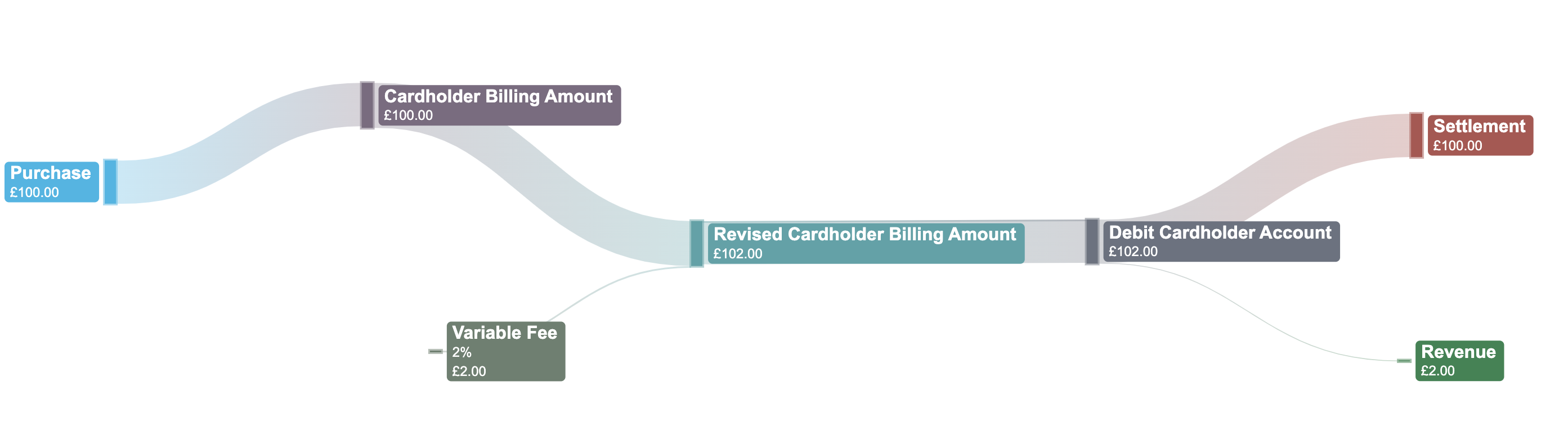 - £100.00 for the purchase and will reflect the cardholder_billing_amount value received from the Network. This is amount to be settled to the Network (plus or minus Interchange)