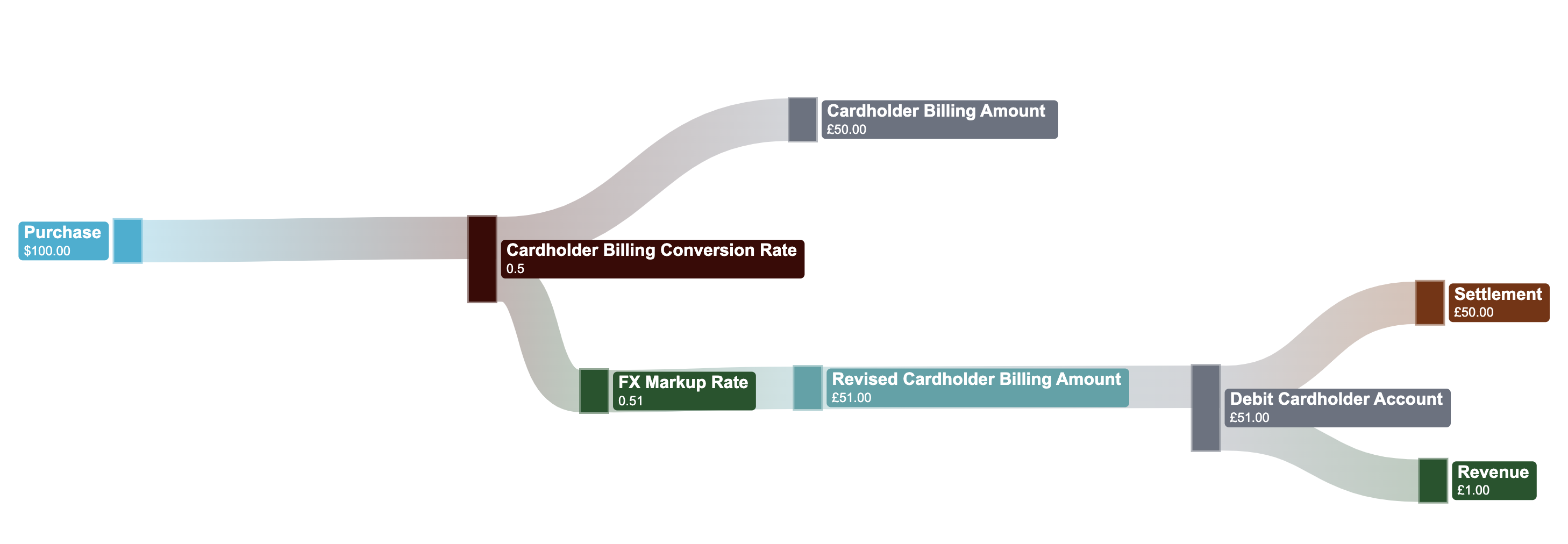 The fx_markup_fee is configured using a %, for example 5%. The fx_markup_fee and revised_cardholder_billing_amount is calculated as follows: