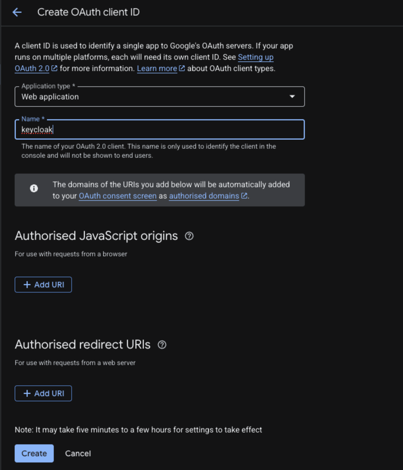 In the Authorised redirect URIs section, add the following URLs: https://keycloak.prod.clowd9.io/realms/vista/broker/google/endpoint https://keycloak.prod.clowd9.io/realms/master/broker/google/endpoint https://keycloak.prod.clowd9.io/realms/clowd9-vista/broker/google/endpoint