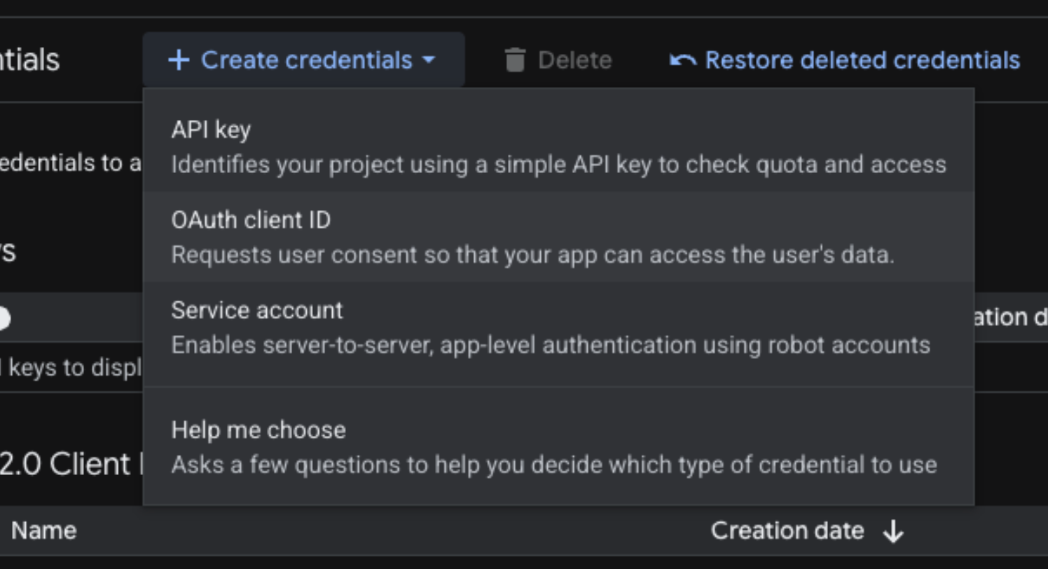 Click + CREATE CREDENTIALS and select OAuth client ID